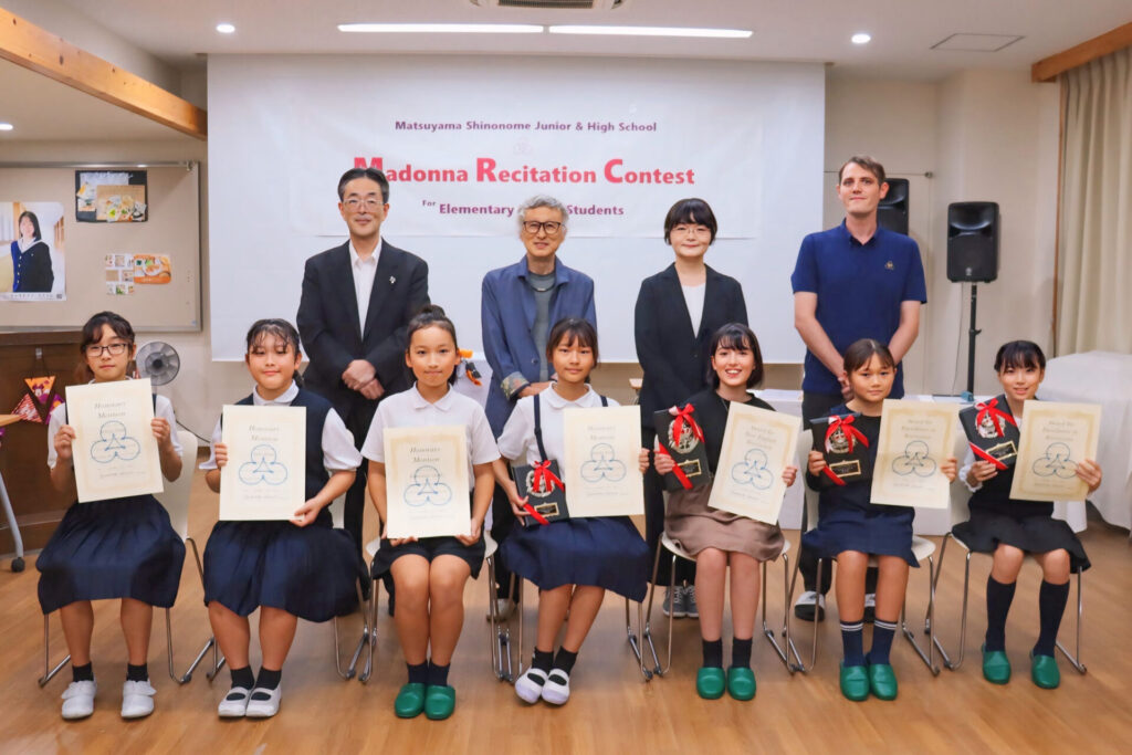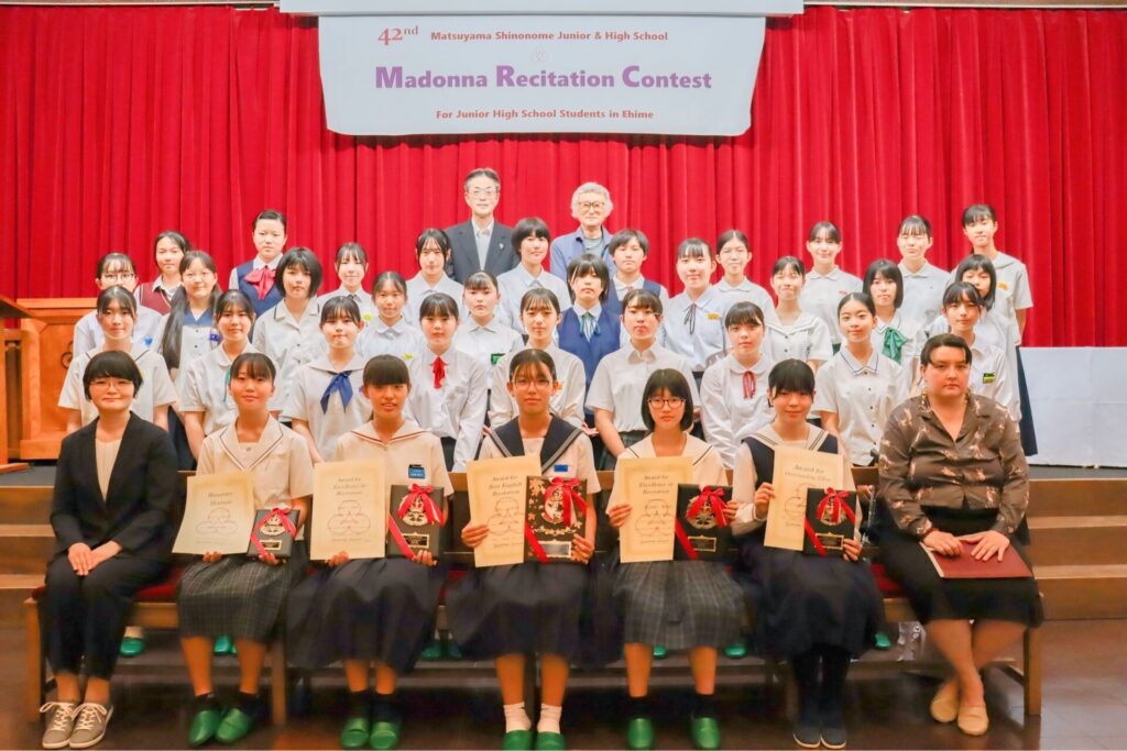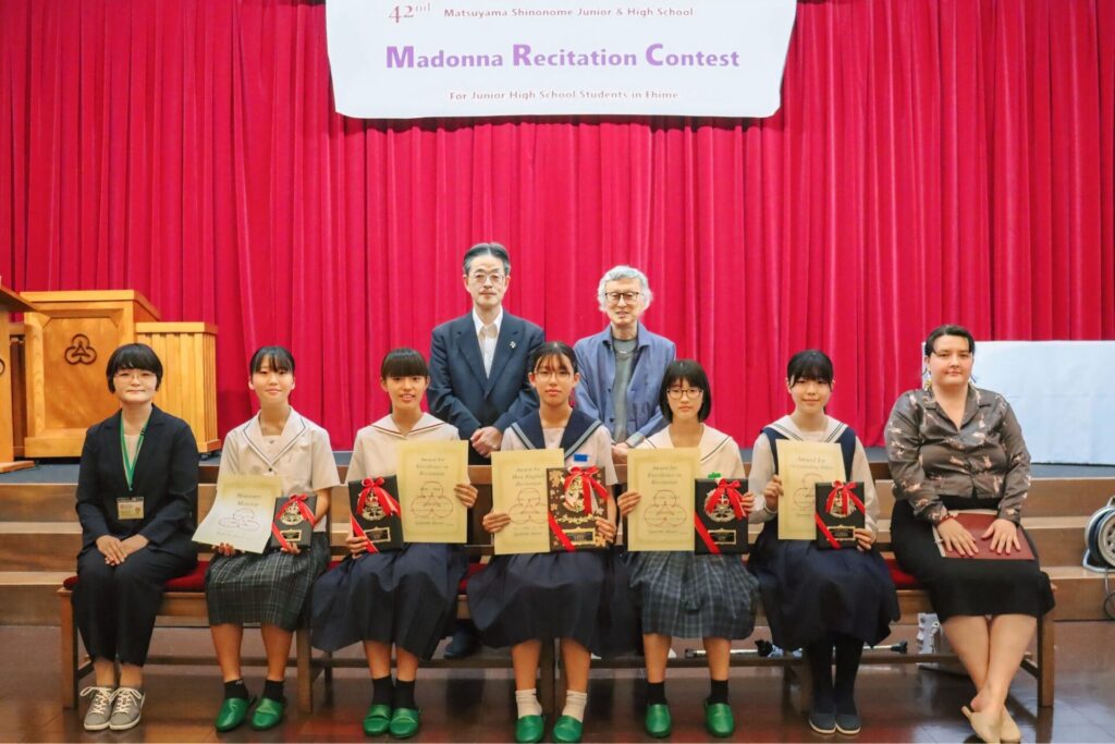 元松山東雲女子大学教授の松本達也先生、愛媛県総合教育センター指導主事の松田詩織先生、愛媛県立松山工業高等学校のALTであるホリー・ジョンソン先生を審査員としてお迎えして、第42回マドンナ・レシテーション・コンテストが行われました。